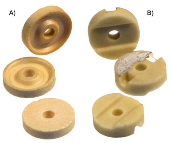 The second type of test items were ceramic sealing plates for valves, used, inter alia, for water batteries. The diameter of the plates was 15.8 mm and the height was 3.8 mm. The plates are made of oxide ceramics, alumina with 92–99% Al2O3 content. Properties of ceramic plates used in sealing rings were as follows: apparent density 3.4–3.8 g/cm3, bending strength 250–300 MPa, impact strength 4 kJ/m2, Young’s modulus 220–300 GPa, dielectric strength 15–17 kV/mm, resistivity 1014 Ω cm, resistance to temperature changes 140–150 K.