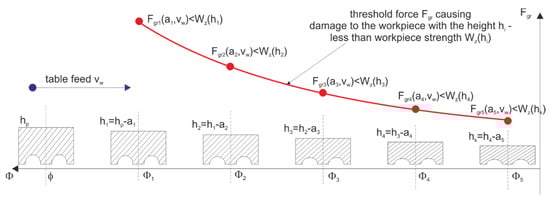 The quality and efficiency of the process depend on the division of the allowance on individual grinding wheels and the selection of the table feed speed. Machine, workpiece, and grinding wheel constraints affect the optimization result. In the described processes of grinding ceramic elements, significant limitations include: limit dimensional deviations, limit values of roughness parameters and surface quality, the resistance of the machined elements to loading with machining forces, and equal grinding wheel life. Since in the considered grinding process the dimensions of the elements and the grinding power required to remove the stock are small, there is no limitation related to the power of the machine tool. The main limitation, however, is the strength of the items, which additionally decreases along with the reduction of their height during the removal of successive layers of the allowance (Figure 9).