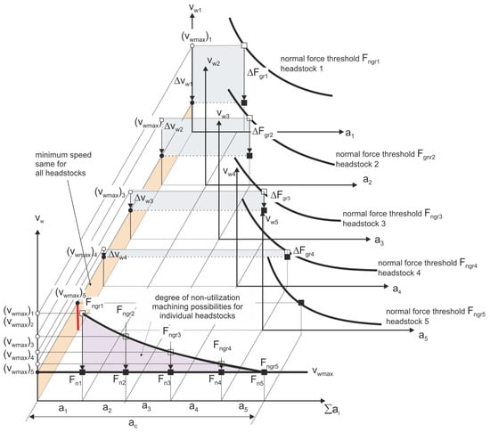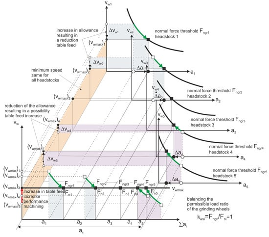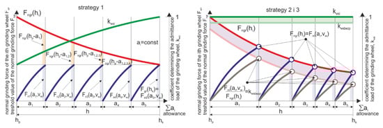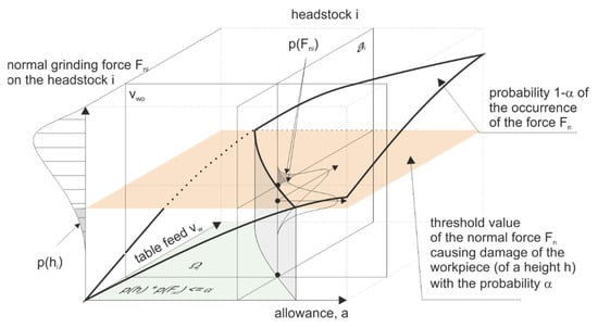 Strategy 2. Optimal allocation of allowance—constant load-to-limit ratio. The machining allowance is distributed over the grinding wheels with the assumption of maximizing the allowable wheel load factor kws. This coefficient is the ratio of the normal grinding force Fn component to the normal grinding force Fngr component causing damage to the workpiece with a probability equal to α. (Figure 12).