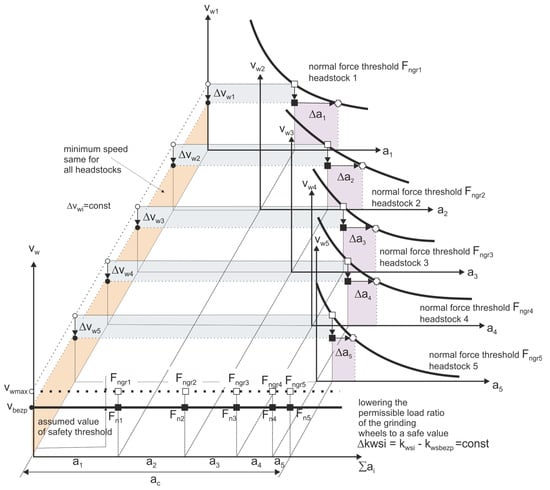 Strategy 3. Optimal division of allowance—constant difference between the decreasing strength of elements and their load with normal grinding force. The adopted machining allowance on individual grinding wheels ensures a constant workpiece safety threshold kwsi = kwsi − kwsafe = const (Figure 13).