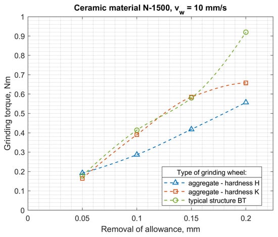 Dependence of the grinding torque on the allowance and the type of grinding wheel for the feed speed vw = 10 mm/s.