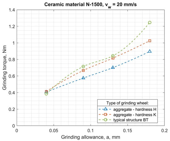 Dependence of the grinding torque on the allowance and the type of grinding wheel for the feed speed vw = 20 mm/s.