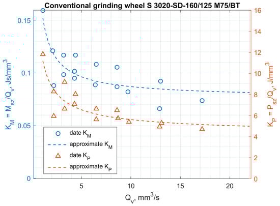 Influence of volumetric efficiency of grinding Qv on the KP and KM coefficients for a grinding wheel of conventional construction S 3020D-SD-160/125/M 75/BT.