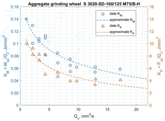 Influence of the volumetric efficiency of grinding Qv on the KP and KM coefficients for the aggregate grinding wheel S 3020D-SD-160/125/M 75/B-H.