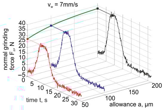An example diagram of the normal grinding force component for the table travel speed vw = 7 mm/s when machining one ceramic element.