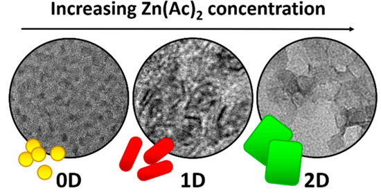 Schematic illustration of the shape control method: increasing the amount of Zn(Ac)2 reagent in the initial synthesis solution causes the transition from 0D to 1D and further to 2D nanocrystals.