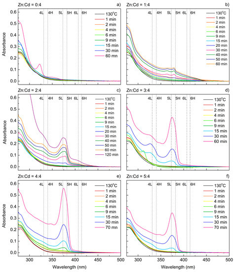 Absorbance spectra of cadmium sulfide (CdS) nanocrystals obtained with different Zn(Ac)2 concentrations recorded for aliquots taken at different stages of the reaction. The Zn:Cd ratio is indicated on top of every graph: (a) Zn:Cd = 0:4; (b) Zn:Cd = 1:4; (c) Zn:Cd = 2:4; (d) Zn:Cd = 3:4; (e) Zn:Cd = 4:4; (f) Zn:Cd = 5:4. The reaction temperature for all samples was 180 °C except 130 °C for the first aliquots. The electron-light hole (L) and electron-heavy hole (H) transitions for 4, 5, and 6 ML platelets are marked with dotted lines based on Reference [22].