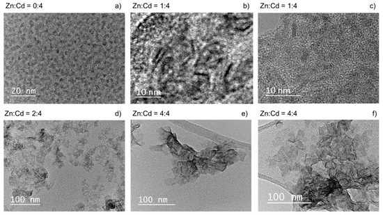 TEM images of four CdS nanocrystals obtained with different Zn(Ac)2 concentrations. The Zn:Cd ratio was (a) 0:4, (b,c) 1:4, (d) 2:4, and (e,f) 4:4. The reaction temperature for all samples was 180 °C, and the reaction time—60 min.