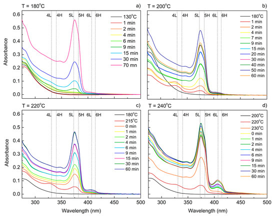 Absorbance spectra of CdS nanocrystals obtained with different reaction temperatures and fixed Zn(Ac)2 concentration recorded for aliquots taken at different stages of the reaction. The reaction temperature is indicated on top of every graph. The Zn:Cd ratio for all samples was 4:4. The electron-light hole (L) and electron-heavy hole (H) transitions for 4, 5, and 6 ML platelets are marked with dotted lines based on Reference [22]. The reaction temperatures are: (a) 180 °C; (b) 200 °C; (c) 220 °C; (d) 240 °C.