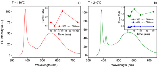 Photoluminescence spectra of CdS nanocrystals obtained with different reaction temperatures and fixed Zn(Ac)2 concentration. The insets show the ratio of the peak intensity related with excitonic emission to the peak related with defects for those spectra. The reaction temperature is indicated on top of every graph: (a) 180 °C; (b) 240 °C. The Zn:Cd ratio for all samples was 4:4.