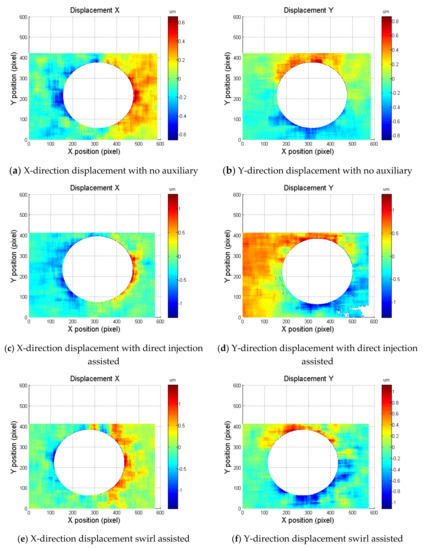 The DIC method was applied to characterize the thermal effect produced by laser drilling for aluminum alloy Al5052 under different assisted laser drilling approaches. The laser drilling parameters are listed in Table 1. The implementation of the displacement measurement of different auxiliary mechanisms consists of the following consecutive steps: (1) To obtain precise determination of the positions of the specimen for the reference image, a pilot hole was drilled. (2) During the DIC analysis of the captured images, a square area with a size of 161 × 161 pixels in the middle of the specimen was chosen as the region of interest. After capturing the DIC reference image, different assisted laser drilling methods were used to produce residual thermal strain by drilling a hole in the region of interest. The DIC image of the area around the drilled zone was then captured and analyzed. The acquired images were processed using a self-developed DIC program to obtain the surface deformation. Figure 8 shows the displacement distribution of the X-direction and Y-direction of the test piece after laser drilling with different auxiliary assisted methods. The center of the machining displacement was deducted from the diameter of 160 pixels (about 650 μm), and the X-direction can be seen. In the displacement map, the left side of the hole is red (moving in the +X direction) and the right side of the hole is blue (moving in the −X direction). In the displacement distribution in the Y direction, the hole is red (moving in the +Y direction) and blue under the hole (moving in the −Y direction). This proves that the material near the hole after laser drilling has a very high temperature gradient, which causes the test piece to experience thermal stress.