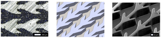 The realisation of such structures in the PEMFC context requires that chosen materials are compatible with low temperature hydrogen fuel cell constraints, i.e., robust and electrical conduction. These constraints raise open questions that have not been addressed in the literature. Indeed, experiments having reported passive directional water motion driven by microstructures [5,6,7,9] used other liquids than water and other materials than metal. Then, there is no evidence that reproducing the pattern found in literature will lead to water wicking because water on metal is less wettable than other couples liquid/substrate used in the previous references. Moreover, if the technology progress of additive manufacturing allows complex geometry designs in metal, especially in the field of fuel cells [31,32,33], none have been made, to our knowledge, at the scale of a few tens of microns.