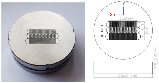 Three adjacent structures exhibiting fin shaped channels added to the steel base by SLM. (left) Actual A, B and C structures. (right) CAD design documenting the total length and width of each structure, in millimeters.