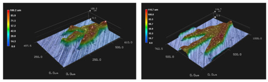 However, the similarity with the experiment leads us to infer that such thin liquid films actually exist. An explanation for these thin films could be the presence of surface irregularities at the microscale made by SLM manufacturing (Figure 3). The interstices between defects act as capillaries into which water may infiltrate and bypass the corner . Therefore, the defects decrease the dissymmetry of water wicking by, on one hand, allowing a wicking in the negative direction and another hand, by slowing down the front (stick-slip motion) in the positive direction.