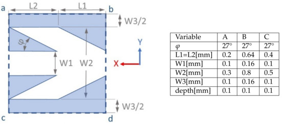 A single cell of the pattern from which is deduced the capillaries. The blue colored part is the fused melted metal with a height of 0.1 mm. The bottom of the capillary colored white. Both parts create an elementary cell which is included in the rectangle ‘abcd’. Adding copies of this rectangle adjacent to its parallel to y sides defines one channel and its walls. Then, adding adjacent copies of the ensemble forms the capillaries for structure A, B or C.