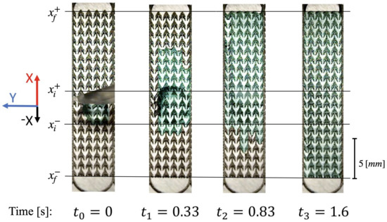 Conversely, decreasing from speeds up the wicking front progression in the x direction (Figure 14). However, this affects the front pinning at in the direction. For instance, at , the fluid spreads over a larger area before retracting and remaining pinned at (Figure 15). This dynamics results from a competition between inertia and surface tension. There is a critical value, noted , below which the front is no longer pinned at and water spreads in both directions. Even in this case the wicking is slower in the than in the x direction. Though the front is no longer pinned, the edges constrain the flow to spread out in a thin film beyond . Since viscous dissipation is strongly related to the height of liquid films, the kinetic energy is almost totally dissipated passing through in the −x direction as a thin film. Thus, the flooding in the V-region is slow and this explains the slower wicking than in the x direction.