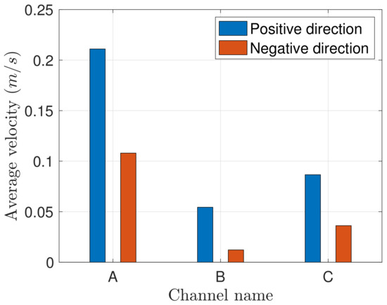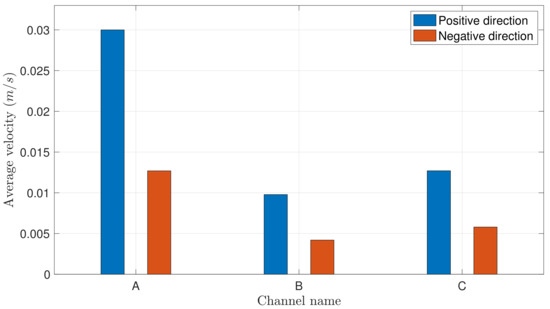 Average velocity absolute values of water wicking in x and −x directions for the three different channels A, B and C.