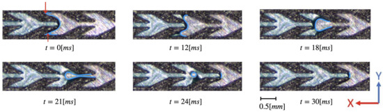 Evolution of water transport in channel type B in the negative direction. Experimental conditions are the same as in Figure 5. Water is colored in blue for better visibility and the triple line is highlighted by a bold blue line. Both red arrows for the panel at [ms] indicates the presence of water in the tip of the fin.