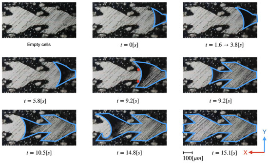 In the negative direction, we were able to capture slow down of the front dynamics during the experiments of Figure 5. In the first snapshot ( [ms]) of Figure 7 the front is blocked at the right (−x direction) of the first cell in the thin straight channel. However, the second cell is not completely dry: a small amount of water can be observed in the tip of the fin (see red arrows in the first panel of Figure 7). The fin volume is progressively filled up by water, first slowly till [ms] and then faster until [ms]. At [ms] the water continues into the next cell in a same way as for the snapshot at [ms]. Therefore, the front remains blocked at the entry of the second cell but the water finds another path to advance to the second cell. The reason of the existence of the thin water film connecting the blocked front is unknown. One possibility is that water is flowing on the upper surface of the pattern. However, the video cannot corroborate or infirm this assumption.