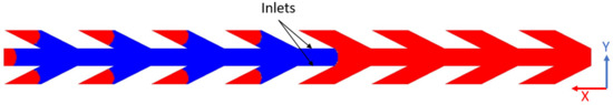 The 2D variant of the numerical code described in Section 4 represents a three-dimensional two-phase flow invariant in the z direction, between infinite walls based on the boundary in the plane of the elementary cell defined in Figure 4. Such a flow is not expected to resemble our experiment closely, and especially its initial condition that depends on z. Instead, we impose a liquid flux (10.6 [mm2/s]) at inlets located on both parallel sides of the domain boundary as on Figure 9. These conditions are reminiscent of reference [47] that describes a (z dependent) liquid flooding a flat surface decorated with obstacles that exhibit wedges.