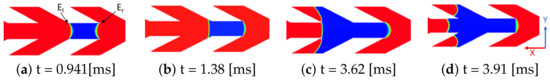 In our simulation we observe that the liquid, driven by the capillary force, begins by completely filling the straight narrow channel that includes the inlet (Figure 10a). The left and right fronts are pinned at edges called and , respectively located at the right and at the left of the inlet. To move again, a driving force is required. In our context, it is the pressure due to the continuous flow at the inlet. Since is much sharper than , the left front rapidly depins whereas at the interface bulges gradually while the triple line remains pinned (see Figure 10a–c). The right edge is thus responsible for front pinning while the edge at is not: this is the key of the directional transport in 2D geometry. Note that the acute wedges at the end of the fins do not pin the front moving to the left since they are wetted by water on both sides (Figure 10c,d). References [2,28] already suggested this quasi-static explanation for the directional transport, based on contact angle hysteresis. At [ms] (Figure 10), the left front is similar to that of the experiment at [s] (Figure 8). However, the 2D simulation does not accurately describe the flow in the fins, as an air volume is trapped in the fins, blocking water progression (see Figure 10d), a phenomenon that we do not observe either in the experiment or in the 3D simulation.