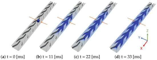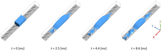 Just after having initially been placed on the structure (at ) the liquid parallelepiped deforms quickly to a smoother shape and begins to wick on the channel bottom in the two directions x and . This can be seen on Figure 11 that shows four snapshots of the simulated liquid volume: at time [ms] it has flooded one cell to the right of its initial position, and two cells to the left. However, the right front remains pinned until [ms] while the left front floods one cell further and proceeds in the x direction. After [ms] the right front floods one cell more to the right before stopping. Meanwhile, the left front continues proceeding to the left until it reaches, at [ms], the end of the computational domain.