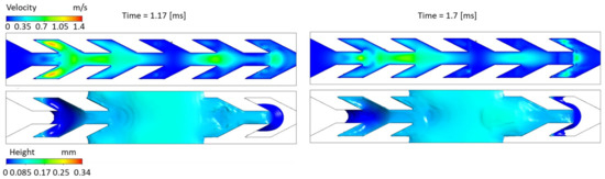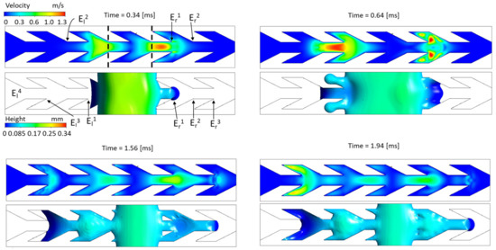 Figure 12 investigates the details of the above described pinning and fin filling processes in the −x and x directions. Figure 12 shows snapshots of a simulation started from an initial parallelepiped shorter than in Figure 11, and slightly longer than the elementary cell. The figure is divided into four panels captured at different times. Each panel documents liquid height below, and the velocity field at [mm] above. Since the two-dimensional approach and the discussion of Figure 11 pointed out the crucial role of convex edges, symbols and () mark the channel cross-sections that include such elements to the right and to the left of the initial liquid volume. At [ms], shortly after the initial condition, the first cell is filled and the water spreads to the left and to the right. The view from above of the front evolution (especially the concave left front) is reminiscent of the two-dimensional simulation sketched on Figure 10. However, this time the convex front at the right stays pinned on for a finite time after which the liquid spreads out further to the right into the wider V part of the channel (Figure 12 at [ms]). Two main reasons explain this discrepancy with Section 5.1. The first one is that a part of the triple line now lies on the channel bottom while contact angle hysteresis only occurs at the edges. Advancing by spreading on the bottom surface and circumventing edges is easier, and it is what we observe at [ms]. The second reason is the velocity field at [ms] which suggests that inertia should not be neglected, differently from the quasi-static approach of [16].