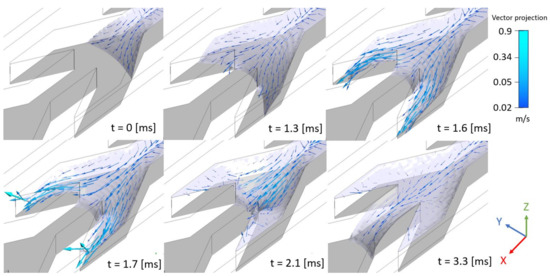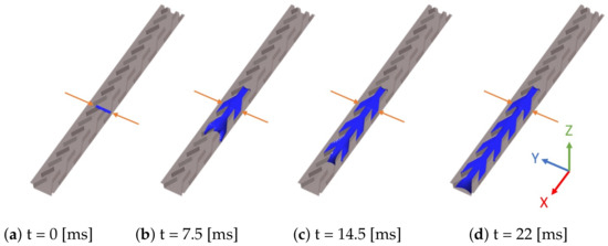 VOF simulation detailing fin filling in the x direction. The continuous color represents the liquid free surface. Arrows display the velocity on the liquid free surface with a color code for the amplitude. However, instead of being started from an initial condition as for Figure 11 and Figure 12, the simulation is issued from the continuous fluid inlet condition described in Section 5.4. The time is set to zero when the liquid enters the V region.