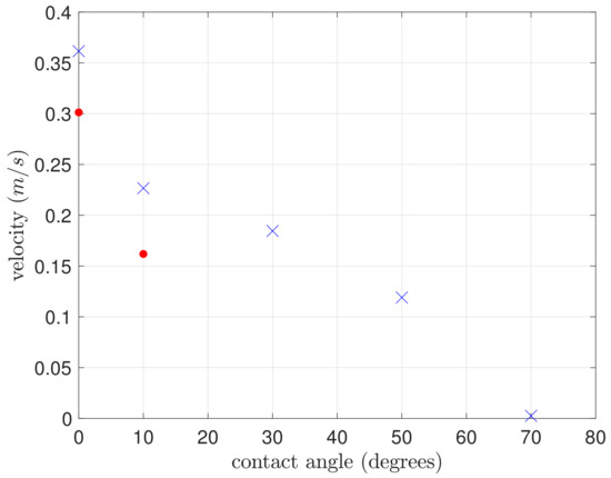 Average velocity of the front as a function of the static contact angle . Blue crosses indicate front velocity in the +x direction while red dots indicate the front velocity −x. Beyond the front in the −x direction is pinned and then velocity is not indicated. The geometry corresponds to the smallest pattern A of Figure 4.