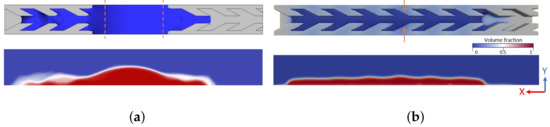 (a) Diffusion at the water/air interface in VOF simulation with compressive scheme. Parameters are as in Figure 11. (b) LBM simulation performs clear phase separation without excess diffusion at the interface with an equal number of cell elements. Red arrows indicate the location of the inlet. Contact angle .