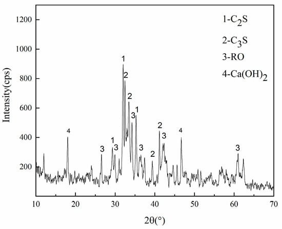 Steel slag was supplied from Taiyuan Iron and Steel Group (Taiyuan, China). The chemical composition of steel slag was detected by X-ray fluorescence ( PANalytical.B.V, Almelo, The Netherlands), as shown in Table 1. The X-ray diffraction analysis of the steel slag was conducted as shown in Figure 1. The refinement of the particle size in steel slag can improve its uniformity [23], and considering the economic factors and homogeneity comprehensively, the particle size was in the range of 0–10 mm. The particle-size distribution is shown in Figure 2. The basic physical and chemical properties of steel slag are shown in Table 2. The water immersion expansion rate was 0.108%, which was far lower than the limit value (test method GB/T 24175-2009 of China, which is very similar to ASTM D4792; required water-immersion expansion rate <2%).