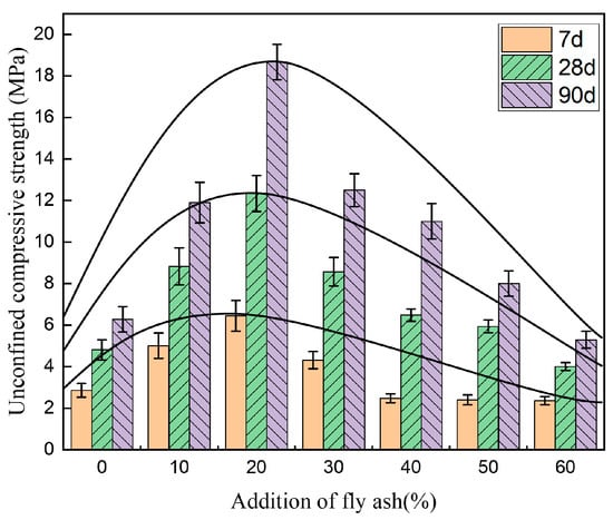 The effect of fly-ash addition on the unconfined compressive strength of the cement-stabilized steel slag. The error bars represent the standard deviation of the test results for nine samples.