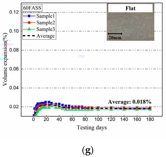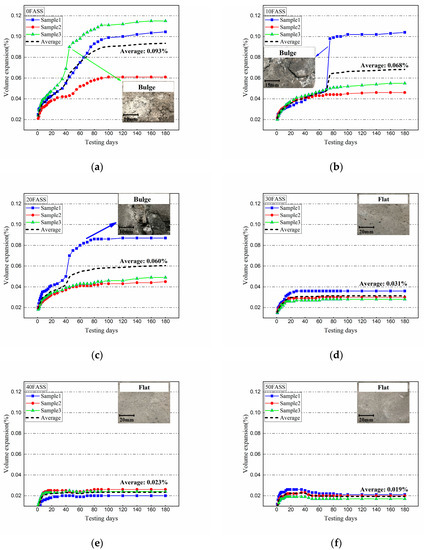 Figure 8a–g shows the expansion rates of 10FASS, 20 FASS, 30 FASS, 40 FASS, 50 FASS, and 60 FASS, respectively. Table 5 shows the expansion rate, average value of expansion rate, dispersion coefficient of expansion rate, and the number and the description of bulges of the stabilized materials when the age was 180 days.