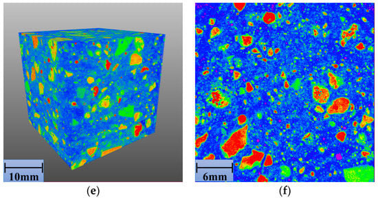 Figure 9a–f shows the X-CT images of 0FASS, 20FASS, and 40FASS; Figure 10a shows the simulation diagram of the cement-fly-ash-stabilized steel slag material (skeleton type); and Figure 10b presents the simulation diagram of the cement-fly-ash-stabilized steel-slag material (suspension type).