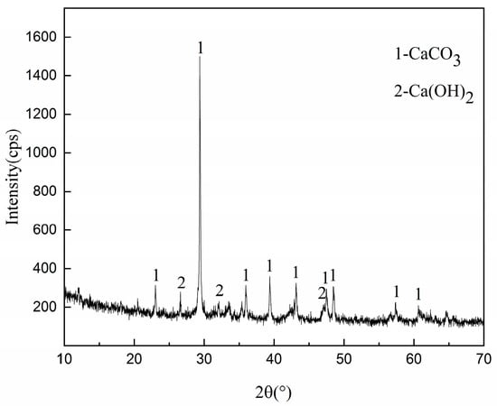 As shown in Figure 4, after the expansion test of 20FASS, the surface of the expansive steel-slag particle was covered with a white material. According to an earlier study [41], these steel-slag particles contained a large amount of dead-burnt lime. Generally, f-CaO exists in the dead-burnt lime of steel slag. The XRD results for the white powder are shown in Figure 11. The main components of the white powder were found to be CaCO3 and Ca(OH)2. Most of the Ca(OH)2 was carbonized into CaCO3 due to long-term exposure to the air. Thus, the f-CaO enriched with steel slag was hydrated to form Ca(OH)2, which increased the volume of the solid phase. The increased volume generated an expansion stress between the steel-slag particles, leading to bulging.