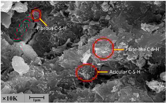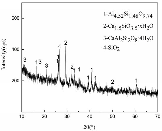 Figure 12, Figure 13 and Figure 14 present the test results for the cement-fly-ash binder in Figure 4. Figure 13 shows the SEM test results for the binder on the side, where the binder contacted the steel slag. The results show that many acicular, fibrous, and plate-like C-S-H phases were formed on the surface of the binder. The EDS results of the three markers in the SEM image are shown in Figure 14. It can be seen that the EDS results of the three markers were in the C-S-H phase. No large crystals of Ca(OH)2 were formed by the hydration of f-CaO from steel slag [42] In addition, the XRD results in Figure 12 also show that calcium silicate and calcium aluminosilicate were mainly produced by hydration of the binder. The XRD pattern shows some peaks of amorphous phase, because the binder consisted of some fine powder of steel slag, and there was no characteristic peak of Ca(OH)2. This proved that the cement-fly-ash binder could react with the expansive components produced by the hydration of the steel slag [43,44].