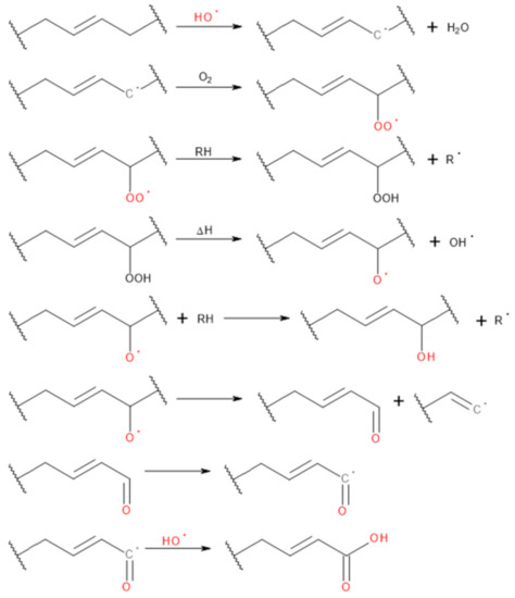 Schematic reactions occurring during oxidation of rubber.