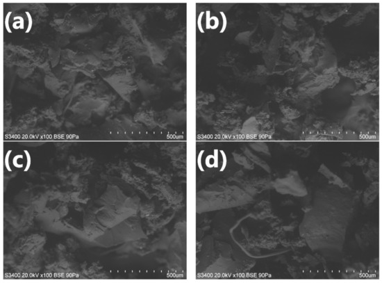 Modification of GTR with hydrogen peroxide resulted in elongation of the processing times. Such an effect could be associated with the noticeable increase of the polyol mixture’s viscosity related to the incorporation of GTR. A similar phenomenon was noted in our previous works [39,40]. As shown in the SEM images of modified GTR (Figure 3), treatment with hydrogen peroxide caused surface development, which resulted in the enhanced interactions with the polyol mixture.
