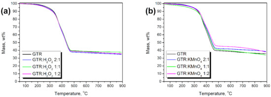 Results of thermogravimetric analysis of applied GTR fillers modified with (a) H2O2 and (b) KMnO4.