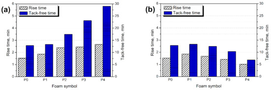 Processing times of reference foam, foam containing neat GTR (a) GTR modified with H2O2, and (b) GTR modified with KMnO4.