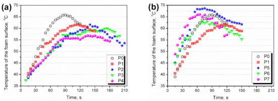 In the case of KMnO4 modification, the catalytic activity fastened the temperature rise compared to P0 and P1 samples and increased the maximum temperature observed at the rising foam surface. Due to the acceleration of chemical reactions, the heat generated during polymerization could not dissipate and was accumulated inside the foam, increasing its temperature.
