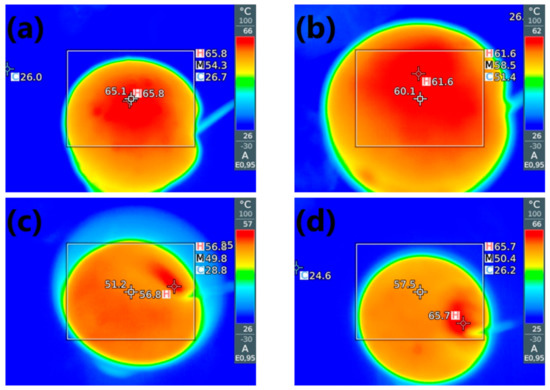 Photographs from thermographic camera showing the maximum temperatures during foaming of (a) P0, (b) P1, (c) P4, and (d) P7 samples.