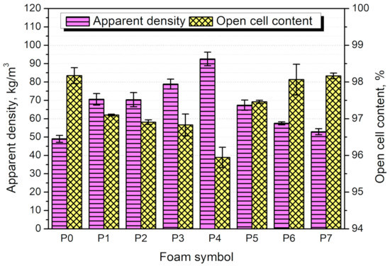 The pretreatment of GTR particles with the hydrogen peroxide caused an increase in apparent density proportional to the applied modifier content. Such an effect is associated with the elongation of the processing times. As mentioned above, peroxide treatment of GTR resulted in the significant development of particles’ surface area, causing the enhanced viscosity of the reacting mixture and reducing the level of foams’ volumetric expansion. On the other hand, the catalytic effect of applied KMnO4 treatment resulted in the acceleration of all reactions occurring inside the foam, including the generation of carbon dioxide. Moreover, due to the higher temperature of the reacting mixture, its viscosity was lower, and gas could evaporate faster, increasing the volumetric expansion. Therefore, the apparent density was significantly reduced, and foam P7 almost reached the level of unfilled foam (52.9 and 49.0 kg/m3, respectively).
