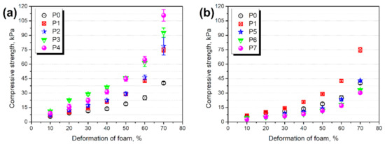 Compressive strength of foams containing (a) GTR modified with H2O2 and (b) GTR modified with KMnO4.