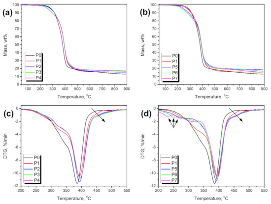 The introduction of rubber particles also resulted in changes in the course of decomposition, which was no longer a one-step process. The value of Tmax3, which is related to the main decomposition step, was shifted towards higher temperatures because of the presence of rubber and the excellent stability of the untreated, crosslinked parts, mostly styrene-butadiene rubber present in tires (see Table 3). It was marked with an arrow in Figure 10. Also, it can be seen that the values of Tmax1 and Tmax2 correspond to the decomposition of GTR—probably the oxidized part and the urethane and amide bonds generated during interactions of modified rubber with isocyanate groups. These bonds show lower thermal stability comparing to the soft segments originated from polyols’ macromolecules [46]. Also, for KMnO4 treatment, the incomplete development of matrix and unbound fragments of polyol chains could reduce material stability. For samples P5–P7, the additional degradation steps at lower temperatures are particularly noticeable.