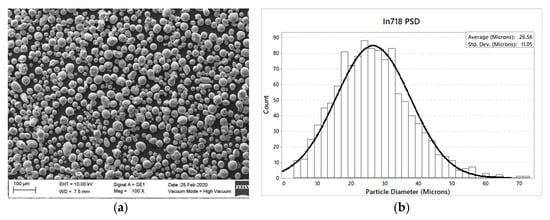 Truform In718 powder was acquired from Praxair (Truform 718 metal powder, Monterrey, Mexico). The overall chemical composition provided by the supplier is summarized in Table 5. The alloy is estimated to possess a hardness (Brinell, HB) value ranging from 240–410 kg/mm2. Figure 1 shows scanning electron microscopy (SEM) images of the powder as received. The average powder diameter is determined to be of 26.56 µm. Figure 1b illustrates the powder size distribution. Notice from Figure 1a that the powder morphology is of spherical-like shape. However, it is not uniform among the powder particles. Next, the Inconel 718 density, taken from Aerospace Specification of Metals, was fixed to the value of 8190 kg/m3. Specific heat capacity and thermal conductivity were estimated to have the values of 435 W/M·°K and 11.4 J/kg·°K, respectively.
