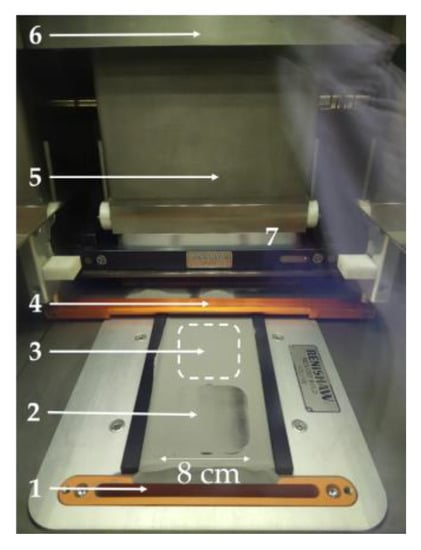 Experimental set-up for the selective laser melting of In718 cubes. The main elements of the experimental set-up are marked: (1) overflow, (2) build plate, (3) powder feed container, (4) recoater, (5) inert atmosphere; argon, (6) laser and optics system; Nd: YAG fiber laser, and (7) building chamber.