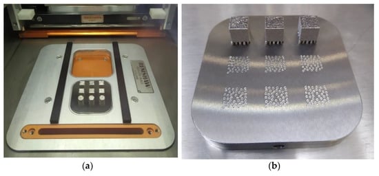 Manufactured samples, in the building chamber and in the build plate of a different set of experimental probes, are shown in Figure 3a,b, respectively. After fabrication, the samples were manually removed from the build plate.