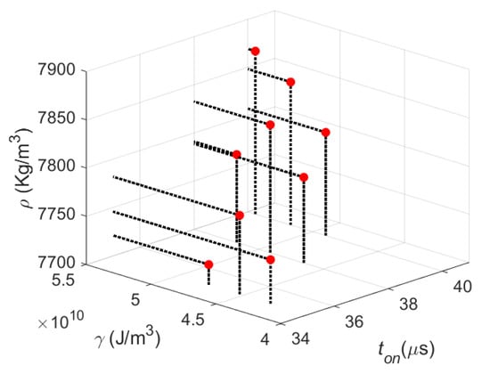 Figure 4 shows a graph of the resulting bulk density (ρ) with respect to exposure time (ton) and volumetric energy density (γ). It is observed, in overall, that with higher exposure time values, better densification is achieved. If the laser remains in contact with the metallic material for longer periods, it is easier for the heat addition to be sufficient to properly melt the powder. In general, higher bulk density values in SLM are obtained at higher conditions of volumetric energy density. The VED concept provides information of the energetic input needed to ensure full melt of the metallic powder, while avoiding the sublimation and ejection of powder particles.