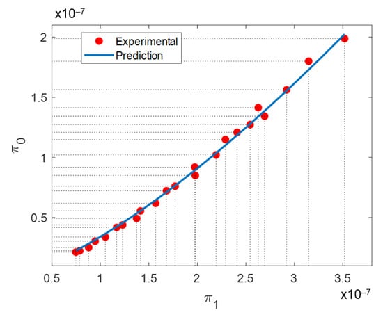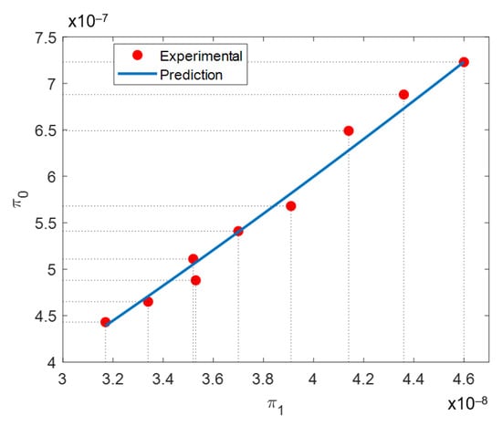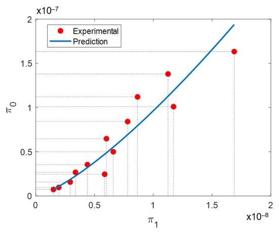 A curve of the dependent π0 and independent π1 dimensionless products along with the prediction provided by Equation (14) is illustrated in Figure 5. From Figure 5, a strong correlation between π0 and π1 is observed. This is a proof that dimensional analysis has succeeded in describing the physic of the SLM process with dimensionless products. Equation (9) depicts the expression for the dependent dimensionless product, π0. The value it attains will be a function of resulting bulk density, the laser scanning speed, and the volumetric energy density conditions. Greater values of bulk density and laser scanning speed will produce a larger π0 value. Volumetric energy density has the opposite effect. For π1, presented in Equation (10), thermal conductivity (κ), specific heat capacity (Cp), and average grain diameter (ϕ), remain unchanged in all experimental points. Then, the only parameters affecting π1 are laser scanning speed and volumetric energy density. Again, greater laser scanning speed will produce greater π1 values, while the opposite will happen with greater volumetric energy density. Laser scanning speed will affect both dependent and independent dimensionless products. However, it will have a greater influence on π0 than in π1.